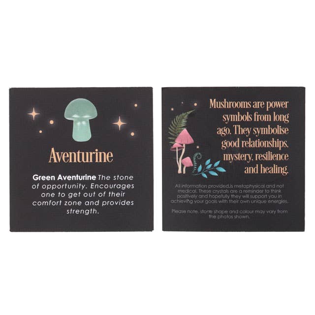 Harness the power of crystal healing with this magical crystal mushroom made from polished Aventurine. This beautiful stone promotes strength and bravery, making it a powerful tool for coping with difficult tasks. Comes in a drawstring bag for easy storage with a matching plug-in card with information. Due to its nature, the stone may vary in size, shape and color.